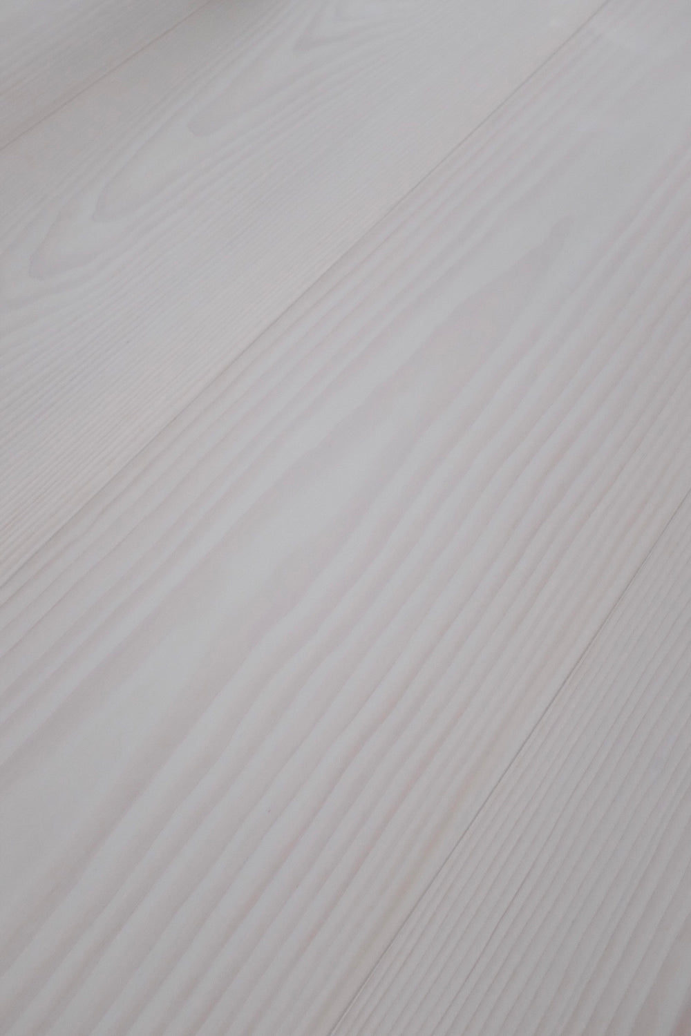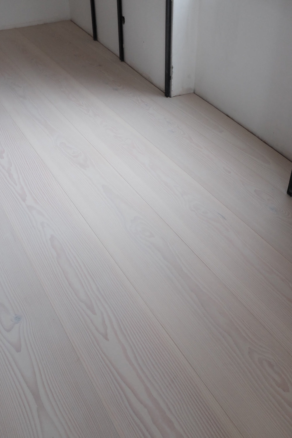 Legno di douglas controbilanciato a tre strati (douglas - abete - douglas). Prelevigato e oliato bianco a più mani.